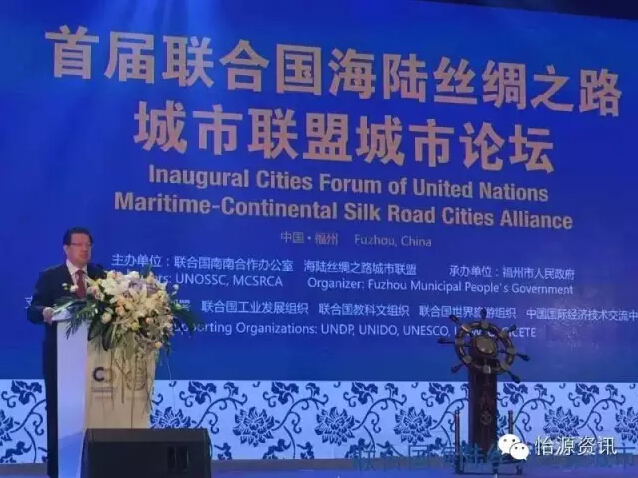 当日,首届联合国海陆丝绸之路城市联盟城市论坛在福州开幕。龙永图在会上进行“顺应全球化的趋势,政府和企业携手推动"一带一路"城市的合作”主旨演讲。